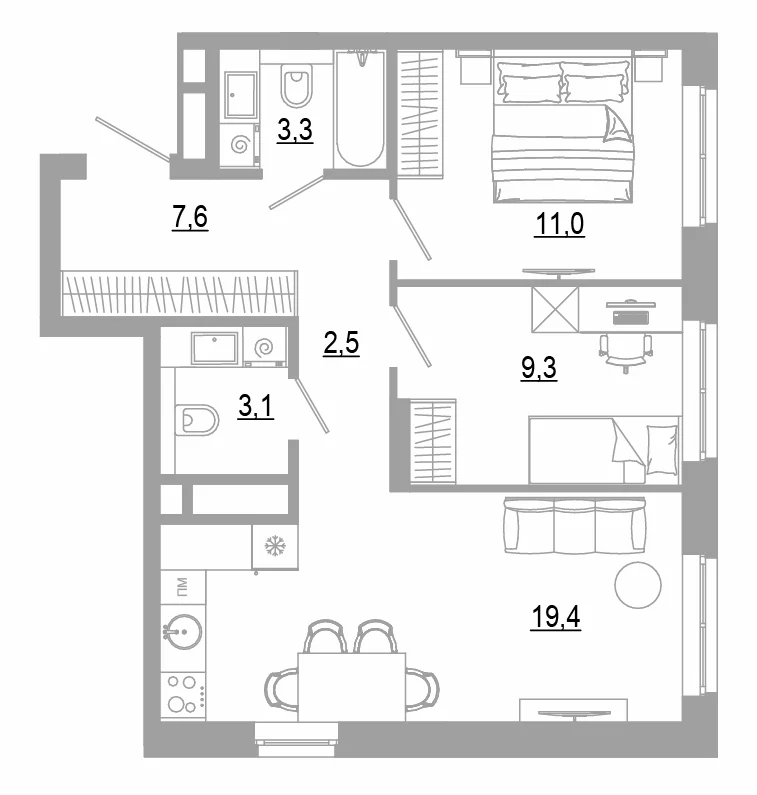В квартире проведены системы отопления и водоснабжения, установлены радиаторы, произведён монтаж окон и входной двери.